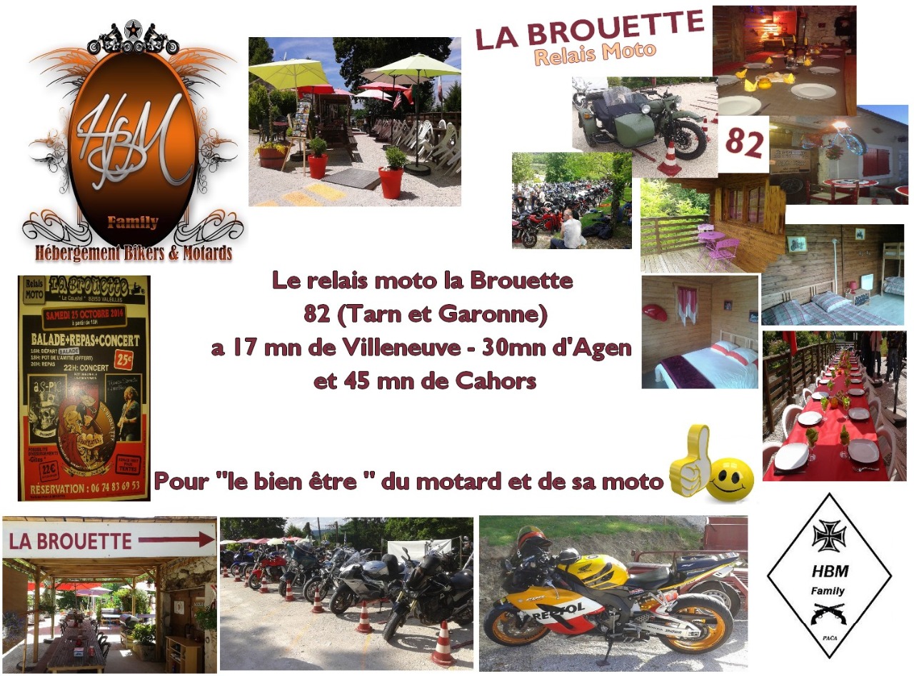 Le relais moto la Brouette ce trouve dans le 82 (Tarn et Garonne) a 17 mn de Villeneuve et 30mn d'Agen et 45 mn de Cahors